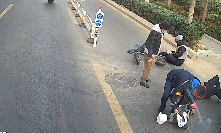 事故现场,又名骑手被电动车紧紧压住,对抗着无法起身;另一东谈主则倒在旁,面露灾难。王鹏快步向前,莫得贸然搀扶,而是先筹谋两情面况,证据两东谈观点志澄莹后,俯身小心翼翼地移开压在骑手腿上的电动车。见物品洒落一地,他又注意肠将它们逐个拾起,妥善放弃在路边安全位置。